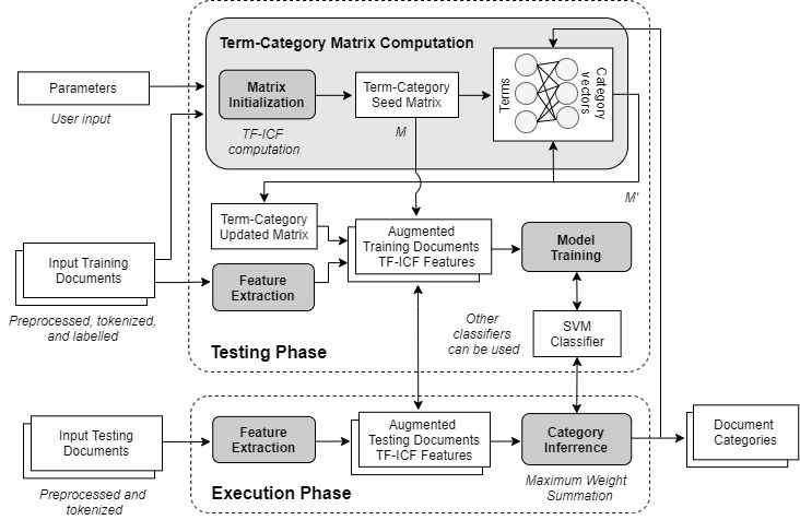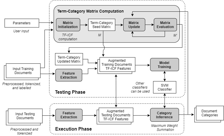 The overall architecture of IterativeAdditive is shown in Figure 2. First, the term-category relationships are represented through two matrices computed using the term-category matrix computation module. The first matrix is populated with the vector weights of our TF-ICF variant The second matrix consists of a dynamic version of the first matrix that is iteratively updated to better fit the document dataset. It computes the relationships between terms and categories with respect to the feature search problem. The outcome of this step is two term-category matrices where every entry represents the importance of a term in describing a category. Once the term-category matrices are computed, aggregate features are extracted using the feature extraction module and are appended to the document representations. These augmented document representations are then used to train the classifier module . In our study, we adopt Support Vector Machine (SVM) as CFE's baseline classifier module, yet other classifiers can be used following the system designer's needs.