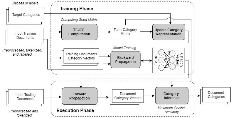 Our second neural variant, titled FeedForwardANN uses a feed-forward ANN to transform input document representations into the category feature space, where document vector representations from the same category are highly correlated and similar to their category vectors. The transformed document vectors are then compared with the target category vectors using cosine similarity for model training and categorization, in order to associate the input documents with their most similar categories. The overall architecture of FeedForwardANN is shown in Figure 4.